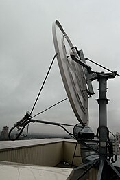 Зеркальные антенны[4] — наиболее распространенный класс спутниковых антенн[5]. Применяются в различных диапазонах, от дециметровых волн до Ka-диапазона, и на различных типах станций — от систем индивидуального ТВ-приёма до центров космической связи. Могут иметь размер от десятков сантиметров[6] до десятков метров[7]. Усиление зеркальной антенны зависит от отношения её апертуры к длине волны, точности изготовления зеркала (чем выше частоты, на которых работает антенна, тем большая точность требуется), коэффициента использования поверхности, зависящего от выбранной конструкции антенны и характеристик её облучателя, точности установки частей антенны (зеркала, облучателя, контррефлектора, если есть) относительно друг друга[8].