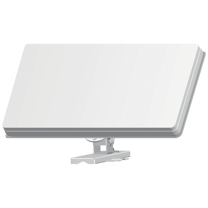 Плоская высокопроизводительная тарелка выглядит так же, как и предыдущая высокопроизводительная система, но с удаленными полюсом и двигателями. в целом гораздо более низкий профиль. Это также позволяет устанавливать тарелку на любую горизонтальную поверхность, расширяя возможности монтажа, особенно на транспортных средствах и лодках.