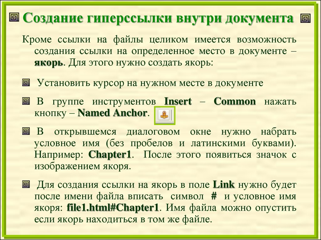 Наиболее распространенным якорем назначения является URL-адрес, используемый во всемирной паутине. Это может относиться к документу, например. на веб-страницу или другой ресурс или на позицию на веб-странице. Последнее достигается с помощью элемента HTML с атрибутом «имя» или «идентификатор» в этой позиции документа HTML. URL позиции — это URL веб-страницы с «# добавлено имя атрибута » — это идентификатор фрагмента.