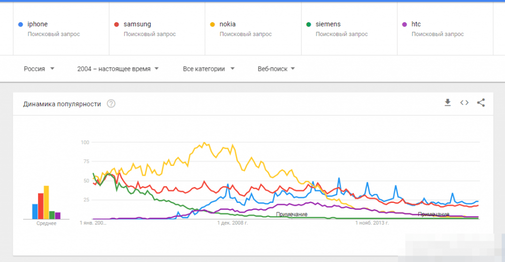 . Следовательно, при интерпретации результатов важно помнить, что мы можем оценивать скорость изменения и сравнения между терминами, но мы не можем оценить общее количество поисковых запросов для любого термина или группы терминов.
