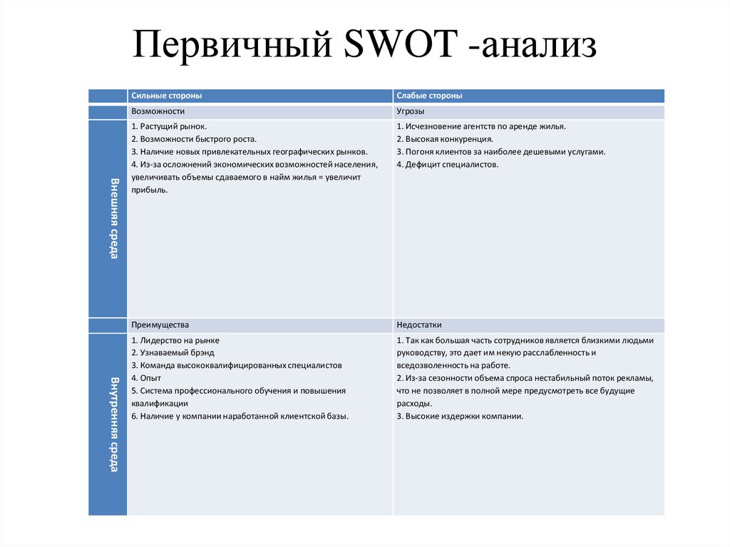Основное условие SWOT-анализа — это честность и справедливая оценка сильных и слабых сторон компании. SWOT-анализ может проводить независимый специалист, чтобы избежать субъективных оценок руководителя или сотрудников компании.