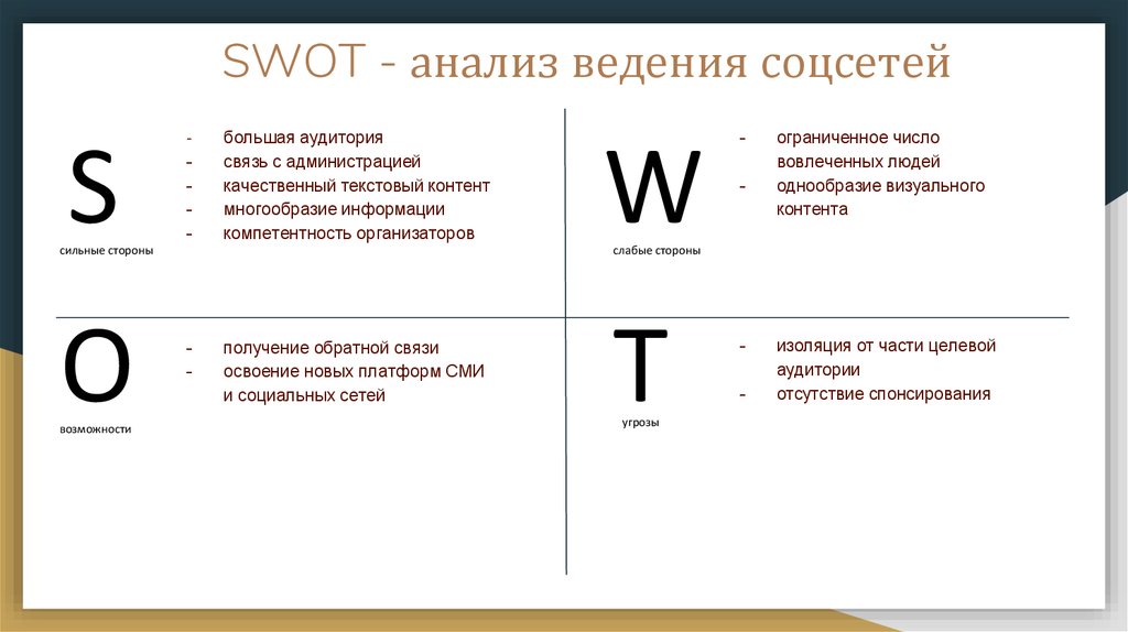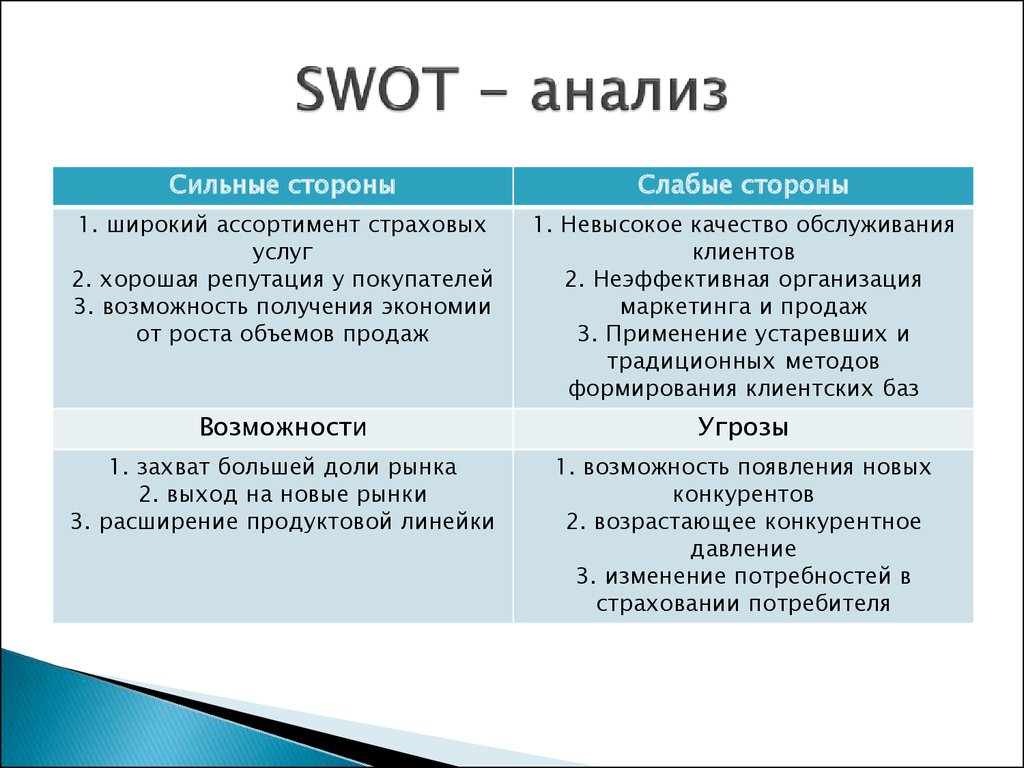 - SWOT-анализ — это совокупность сильных и слабых сторон, возможностей и угроз вашей компании.