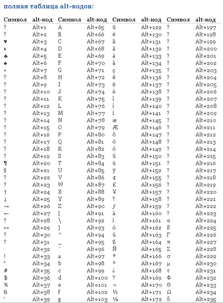 Таблица Alt символов: