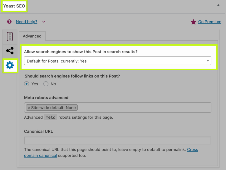 Хотя предыдущий шаг позволяет вам изменить метатег noindex для определенных сообщений/страниц, вы все равно должны подтвердить, что noindex не был установлен в качестве значения по умолчанию в ваших Заголовки и настройки Meta .