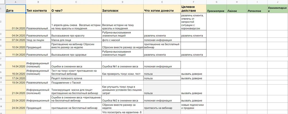 В таком варианте конте-плана удобно отслеживать статистику публикацийОбразец контент-плана: https://docs.google.com/spreadsheets/d/1454vIyC2Z5zHGNB3cNYoAqHOEIL8Jkf1716gBSzzu6k/edit?usp=sharing