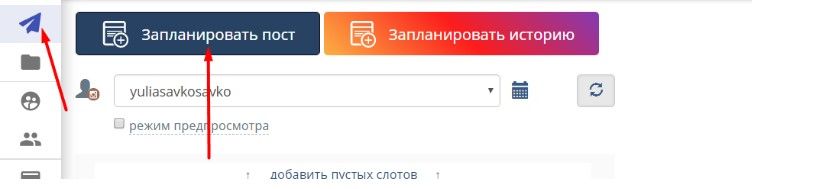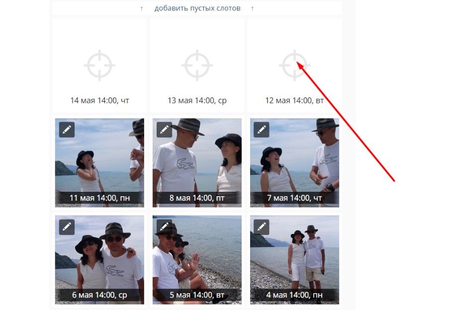 Активация расписания аккаунта в Instagram- Чтобы добавить новые посты, нужно кликнуть по свободному окошку в расписании.