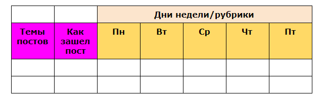 Простой вариант контент-плана с разбивкой по дням неделиЕсли введение рубрик не планируется, контент-план может выглядеть следующим образом: