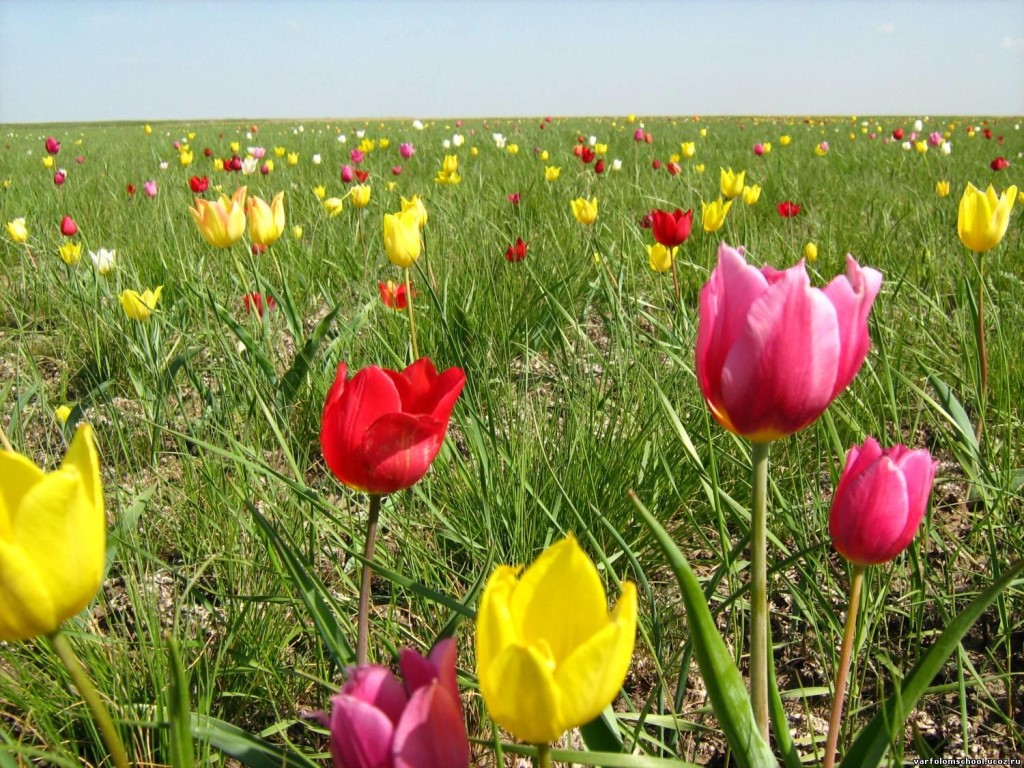 Потом, наконец, появляется тюльпан Шренка – более известный нам. Встречаются и желтые, и всевозможные оттенки красного и лилового цветов, даже двухцветные.