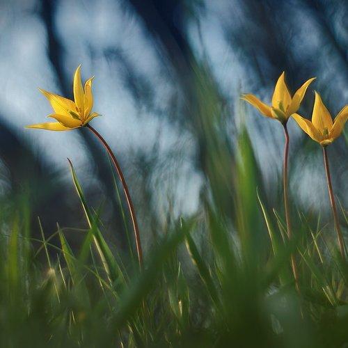 Первыми в нашем регионе расцветают двуцветковые тюльпаны, довольно маленькие, низкорослые, но если приглядеться – очень красивые. Они получили такое название, потому что на одной луковичке обычно расцветают два бутона. Подснежников у нас к сожалению нет, в отличие от Волгоградской области, где массово выходят брандушки, но у нас и снега-то обычно не бывает, так что все логично.