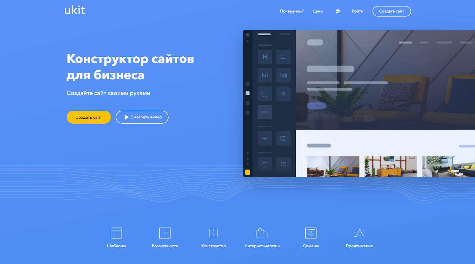 Теперь создать сайт самостоятельно для своего бизнеса стало проще, благодаря конструктору сайтов uKit. Сочетание продвинутых технологий и современного дизайна позволит создать сайт под требования вашего бизнеса и клиентов. Интуитивно понятный визуальный конструктор, стильные адаптивные шаблоны под любой вид бизнеса, большая галерея готовых изображений, надежный хостинг — все это в единой платформе для создания сайта uKit.