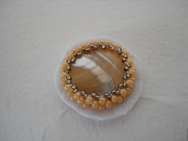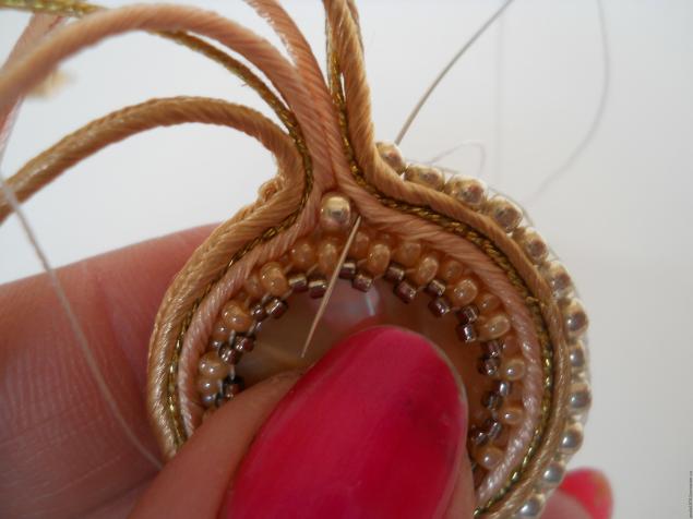 Когда мы обшили кабошон сутжным шнуром, хвостики скрепляем через бисеринку.