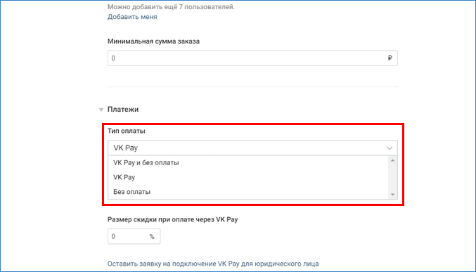 - Пролистать страницу вниз, найти раздел «Платежи». Здесь и устанавливается тип оплаты через VK Pay, размер скидки и прочие опции.