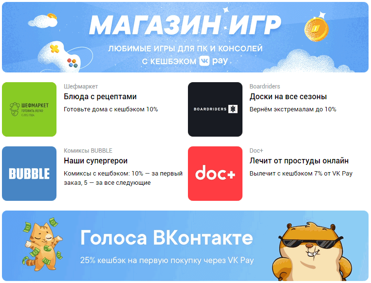 - Покупка товаров у партнеров VK с кешбэком до 20 %.