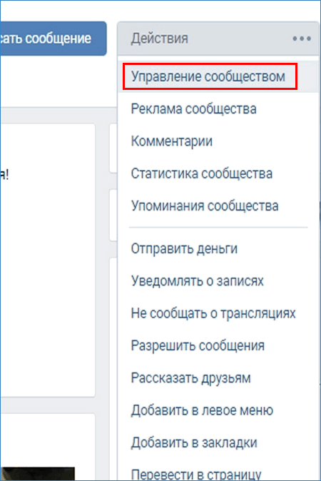 - Выбрать пункт меню «Действия» – «Управление Сообществом».