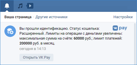 - О завершении процедуры идентификации сообщит соответствующее уведомление от VK com Pay.