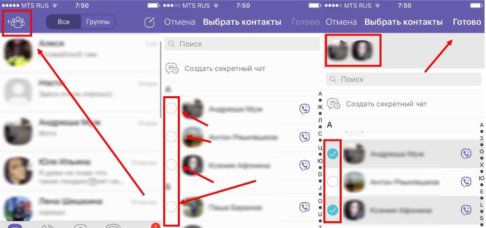 - Встановлюємо позначку на аватарках контактів, присутніх в адресній книзі Viber, і підтверджуємо їх додавання в групу дотиком по галочці вгорі.