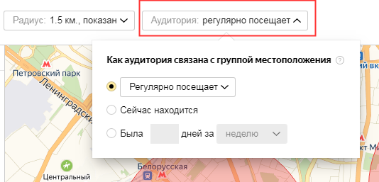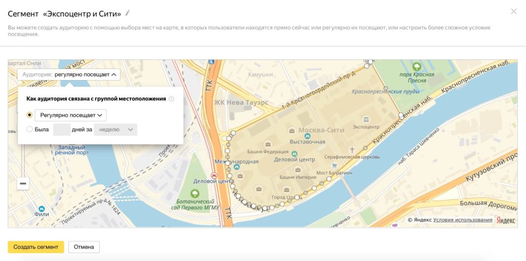 Пожалуй, самая простая в настройке и самая мощная функция Яндекс.Аудиторий. С ее помощью вы можете создать сегмент из пользователей, регулярно бывающих в любой зоне, отмеченной вами на карте.