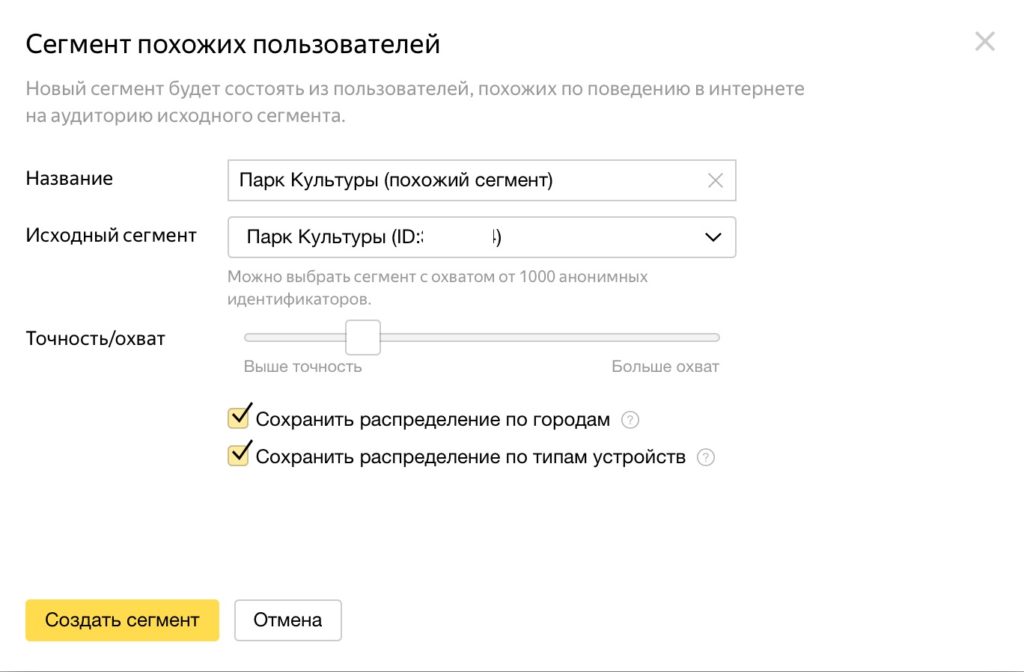 Название для нового сегмента система предложит сама. С помощью ползунка «Выше точность – Больше охват» установите желаемый приоритет: меньше пользователей, но более похожих на прототип, или больше людей, но менее схожих по поведению.