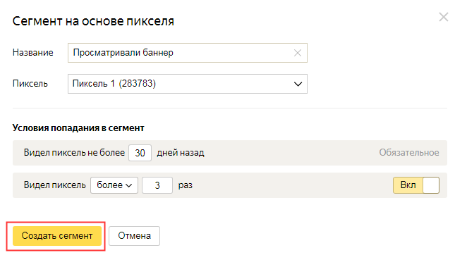 После этого вы можете настроить условия попадания в сегмент: число просмотров рекламы с пикселем и их давность.