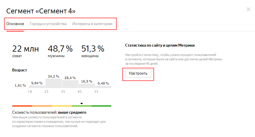По клику на значок диаграммы рядом с сегментом открывается полезная статистика по нему. На вкладке «Основное» отображается сводка по охвату, демографии и схожести пользователей между собой: