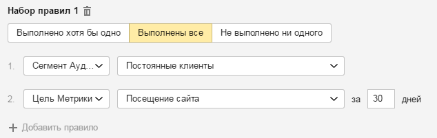 Задаем название (необходимо для навигации) и в наборе правил в качестве данных выбираем «Сегмент Аудиторий».