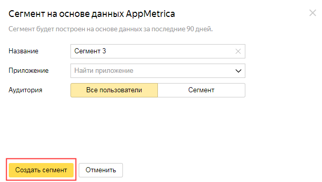 Вы можете добавить в новую аудиторию всех пользователей приложения или только тех, кто входит в ранее созданный в AppMetrica сегмент.